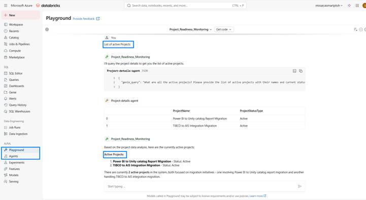 In the Ask Me Anything solution, Agent Bricks power the execution layer. They continuously evaluate enterprise data, identify project readiness gaps, and respond to leadership queries in real time.