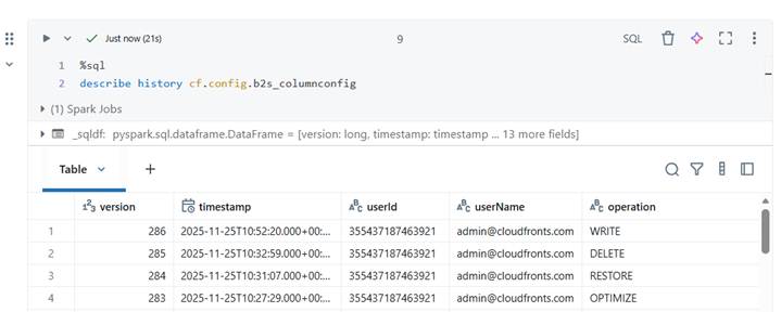 Below is an example of using DESCRIBE HISTORY on a Delta table.