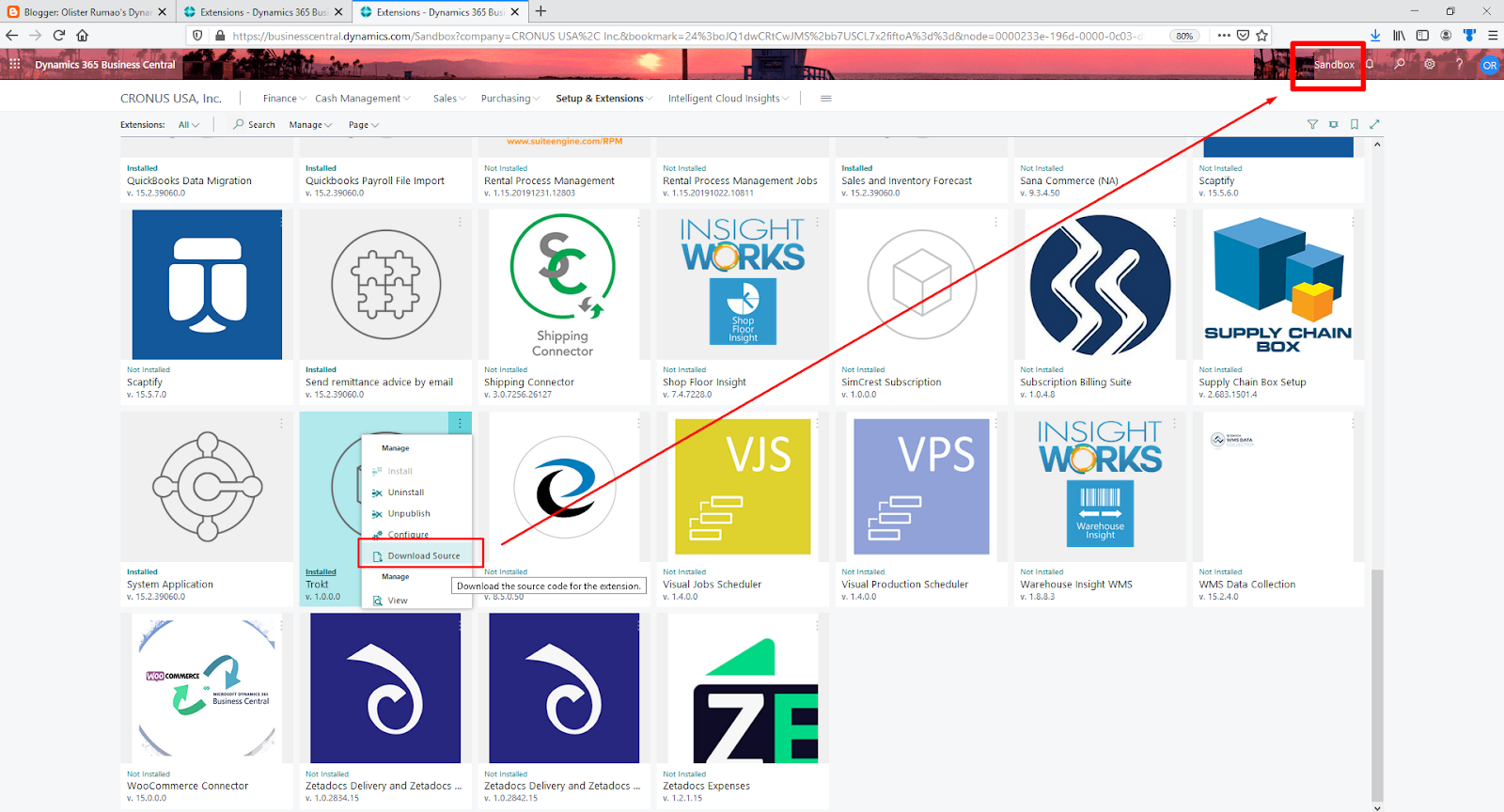 Download Source Code for Installed Extensions in Business Central V15 Sandbox |