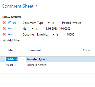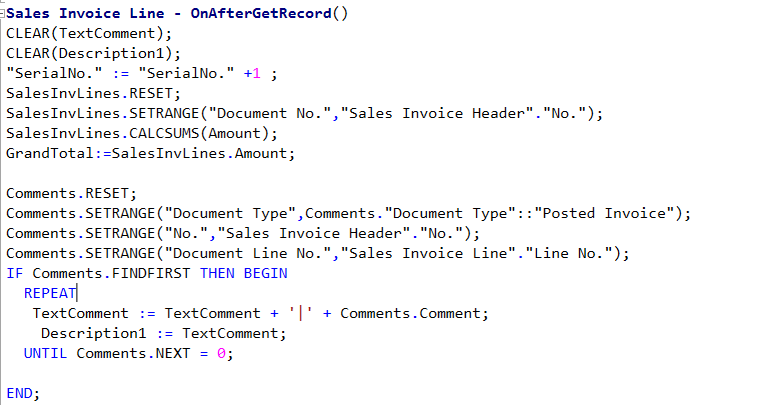 - Getting a combined value field in this we are concating mutliple values seperated by ‘|’. In this case I’m using the comments on Sales Invoice Lines. This can be a single field or combination of mulitple fields