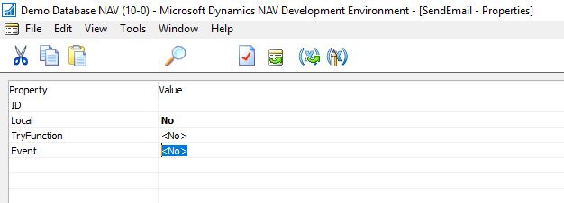 4. Create another global function with another name in this article I’ve used ‘SendEmail’. Set parameter to the record ‘Purchase Header’ and enable it as a variable.