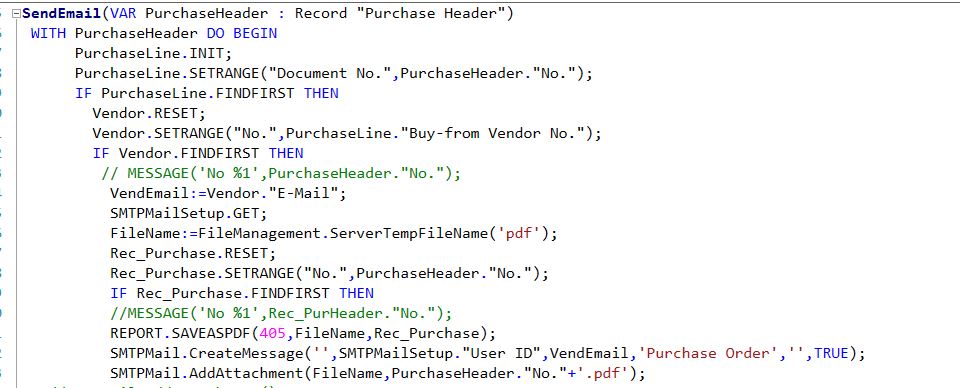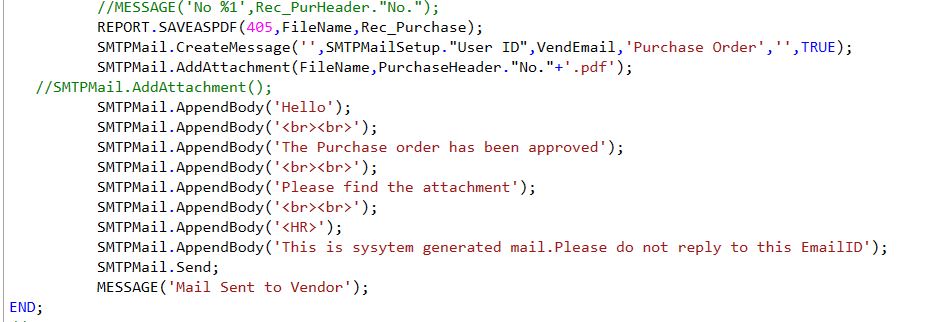 5. In the below code, we first fetch the vendor email id and set it to a variable VendEmail.
