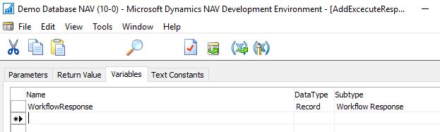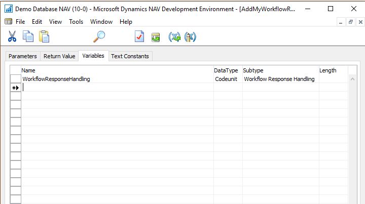 - Select the function and click on the Locals button and in the variables tab, create a variable for codeunit Workflow Response Handling.