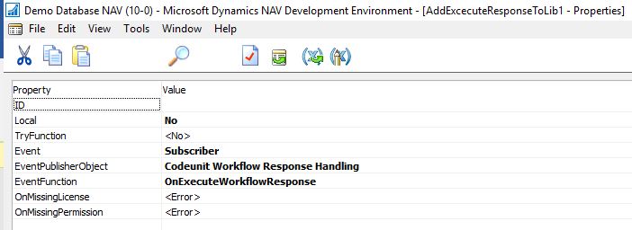 - In the Event Publisher object select the Workflow Response Handling codeunit (codeunit no. 1521)