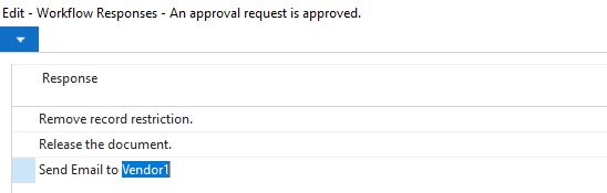In this article, a workflow response is created in the standard purchase order workflow. This response sends an email to the vendor after release of the purchase order i.e when the send approval request of the purchase order is approved by the authorized approver, the status of the purchase order changes to Released afterwhich an email is sent with attachment in a .pdf format to the vendor.