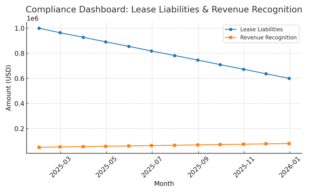 Power BI dashboard with lease liabilities trend line and revenue recognition chart.
