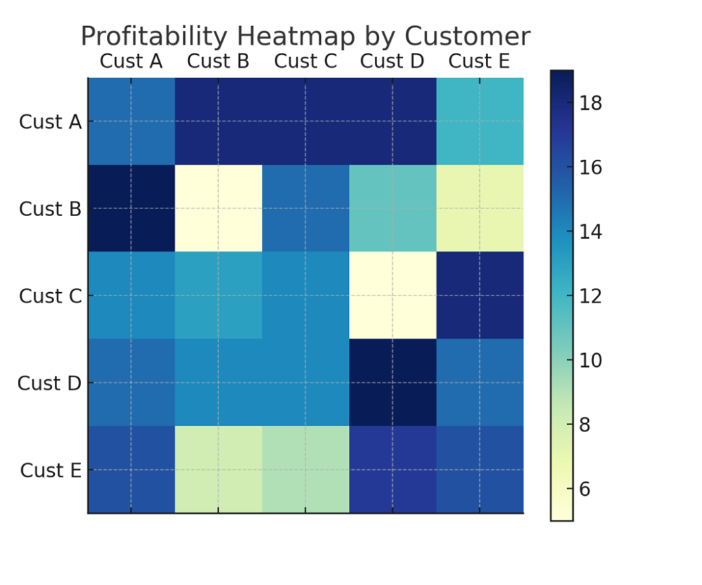 Heatmap of profitability by customer with KPI margin %.