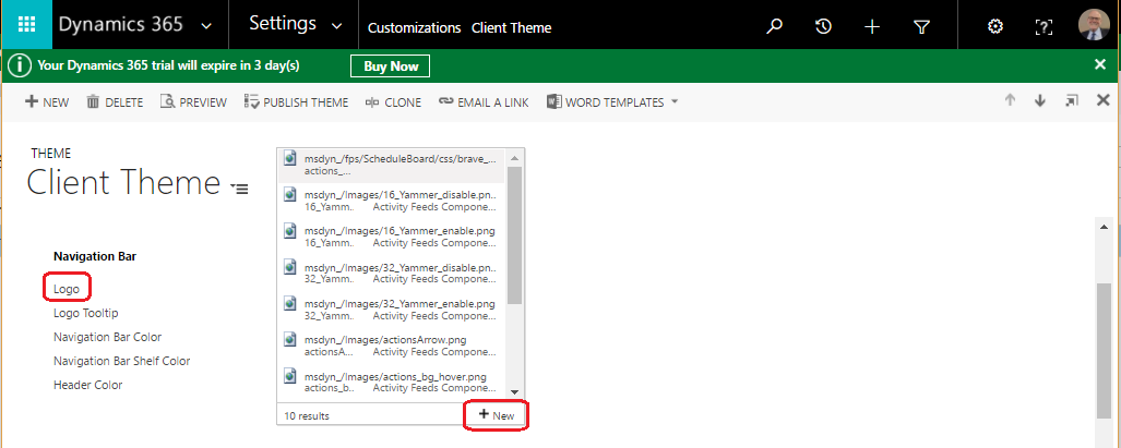 By default, D365 default theme is present in the system. Now If we want to create theme for our organization, select New Theme. D365 default theme can be used as a reference to understand how themes work in D365.