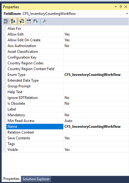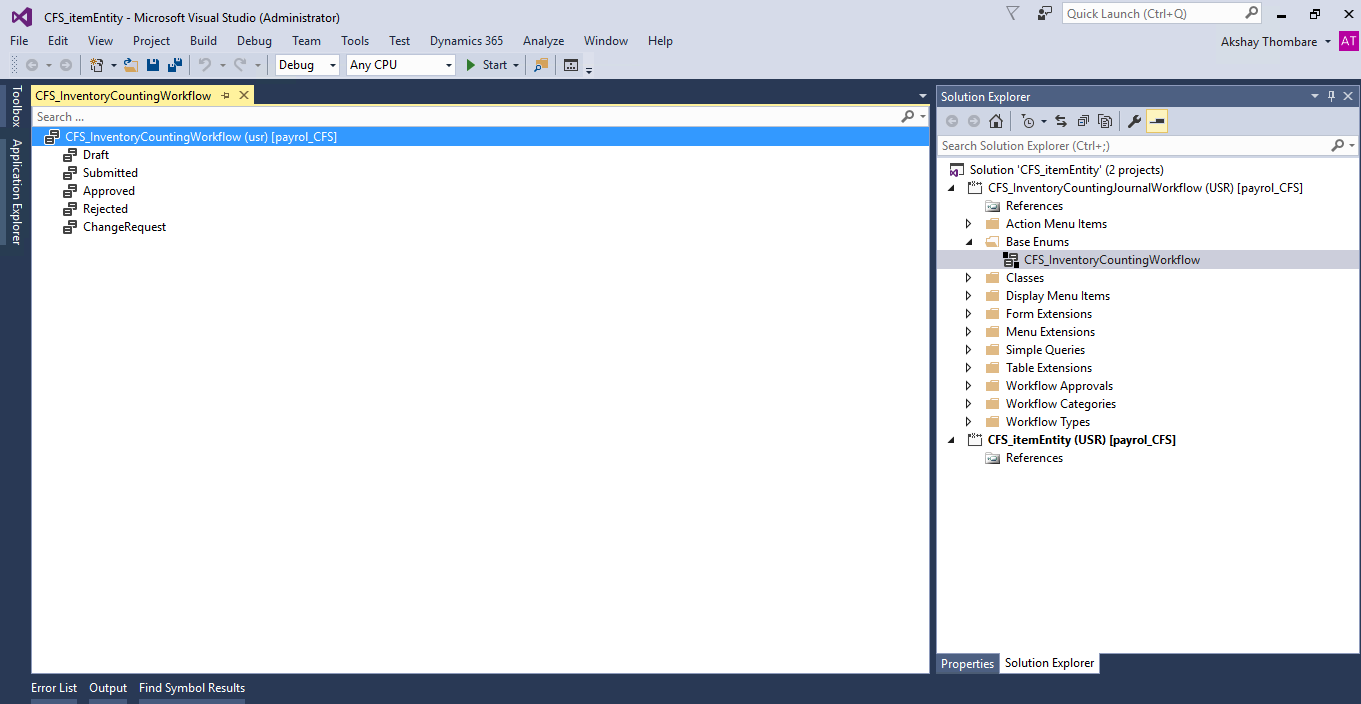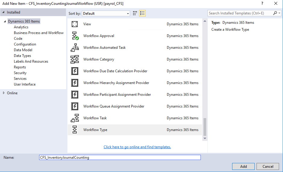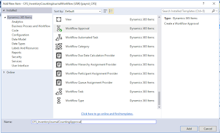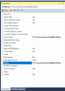 Make sure you have created a solution, project and assign the model to the project. Now add new item and select Base Enum. And Add Base Enum and name it as CFS_InventoryCountingWorkflow