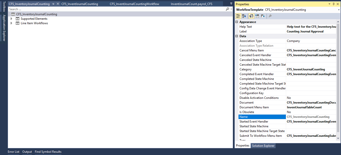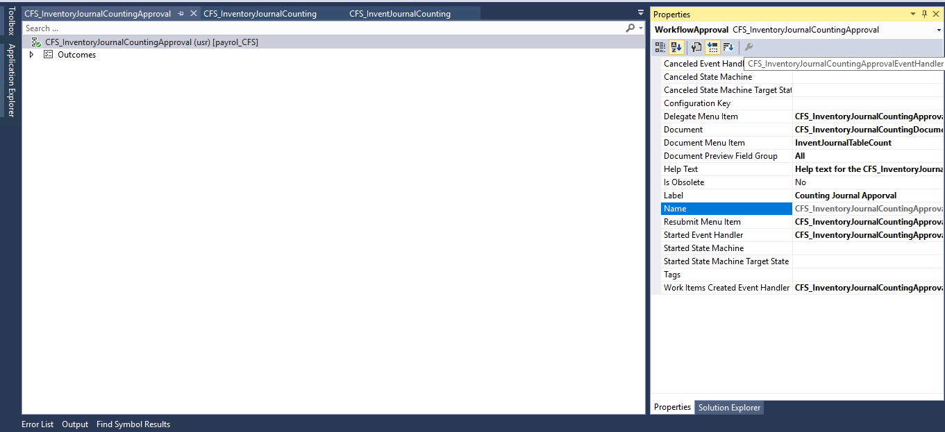 Now we need to add a piece of code to approval event handlers and name element as CFS_InventoryJournalCountingApprovalEventHandler
