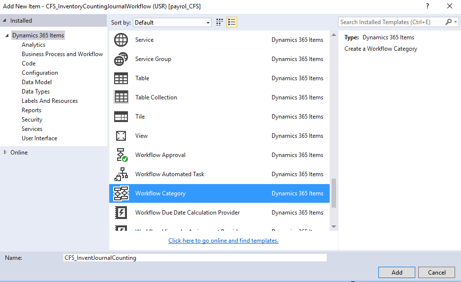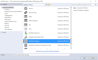 Now we are going to add Workflow category to project and name it as CFS_InventJournalCounting and set the properties as follows