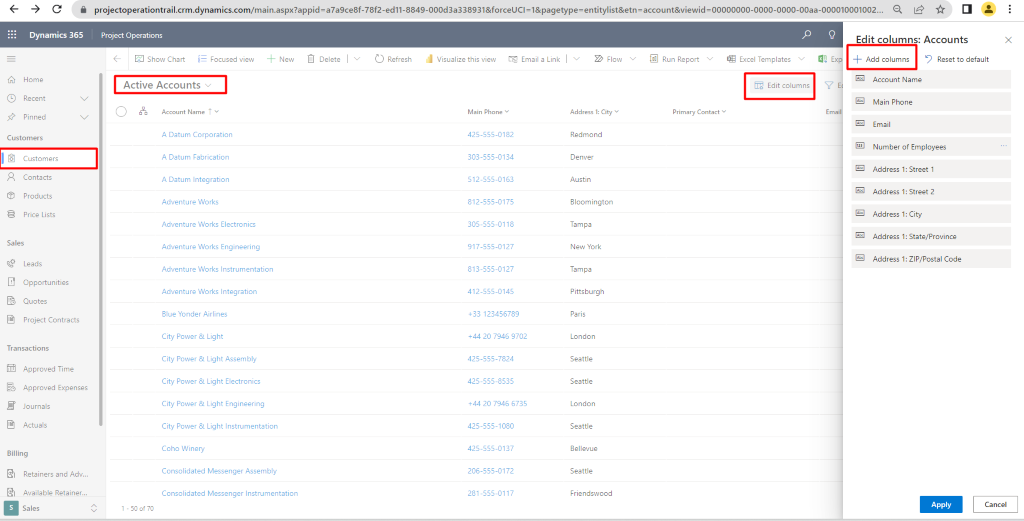 Step 2: On the active accounts view (or any view) click on edit columns and add the columns as per the data you want to be fill in. (Don’t forget to hit apply button at the bottom)