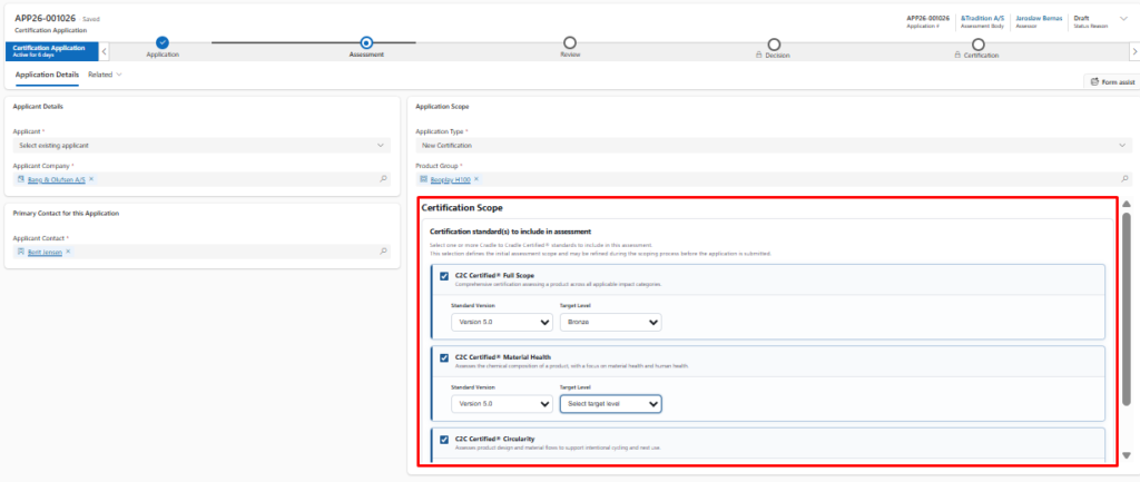 As part of every certification application, users must define a Certification Scope, selecting which Cradle to Cradle standards they want assessed, choosing the correct version of that standard, and setting a target certification level. The available standards include: