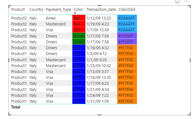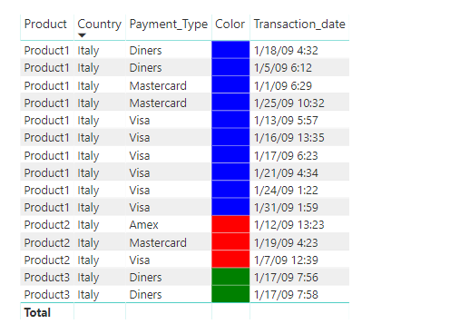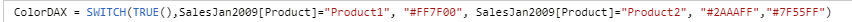 For example, if I want to use color to signify the product name, we can create a calculated column to assign color names to each product as shown below: