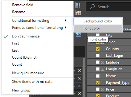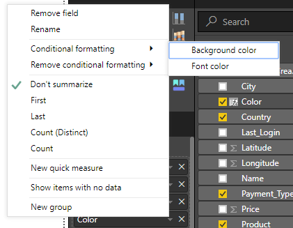Then add that calculated column (‘Color’) to your table, and go to the Conditional Formatting dialog for ‘Color’. Select ‘Background Color’.