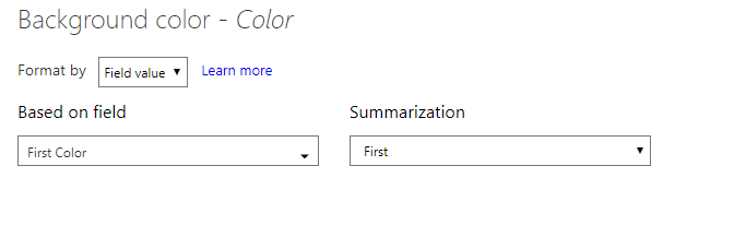 Select ‘Field Value’ in the ‘Format by’ drop-down menu. Since I only have one color name per row, I will select First ‘Column Name’, Summarization ‘First’ and click OK.