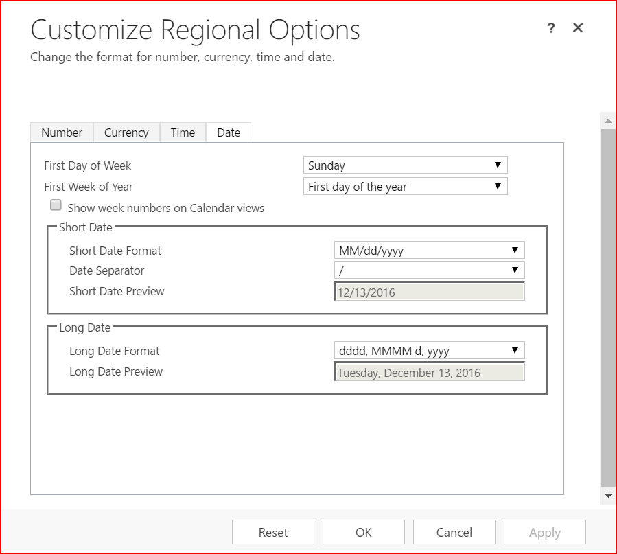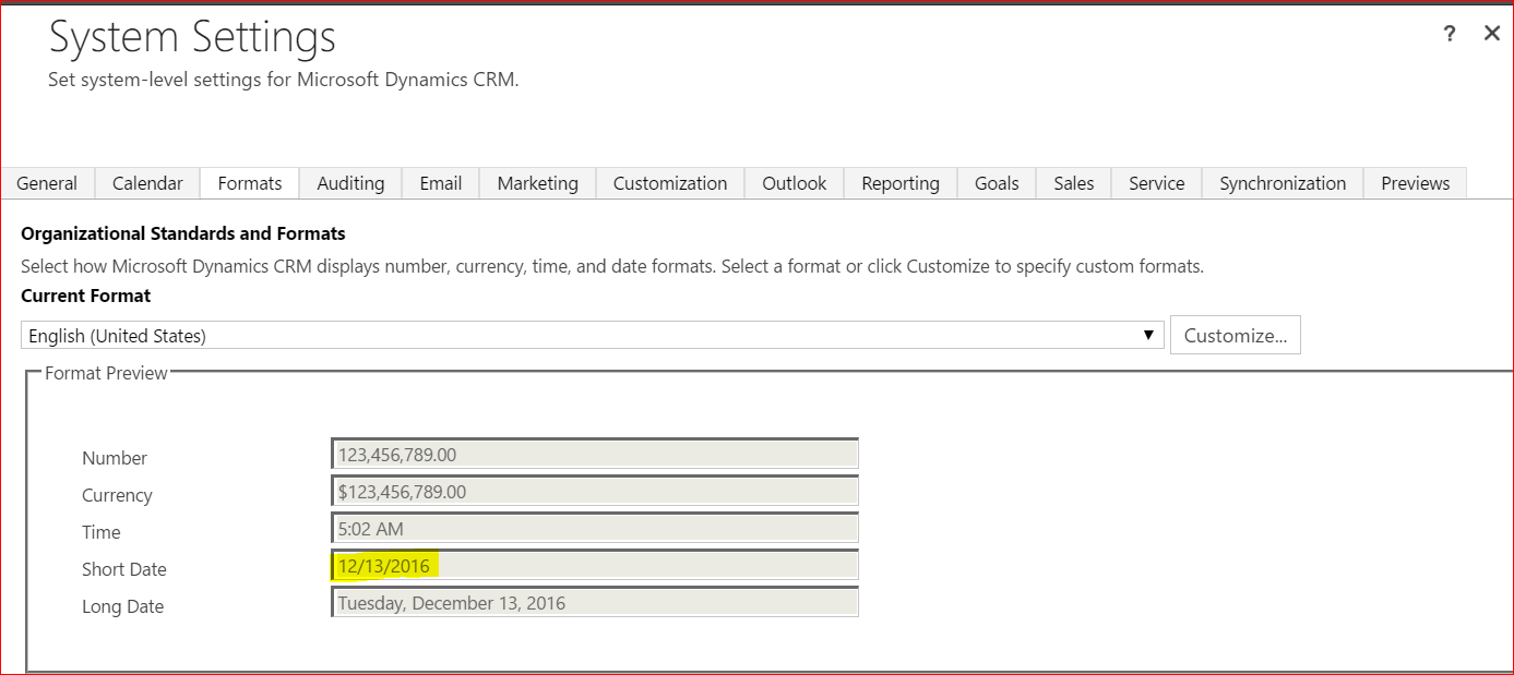 - Login to CRM and verify the default formatting for Dates. (Settings -> Administartion -> System Settings -> Formats.