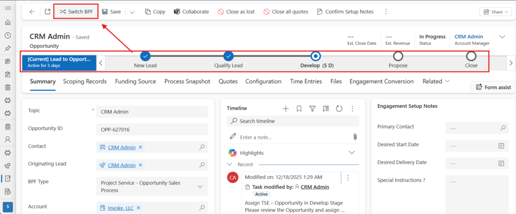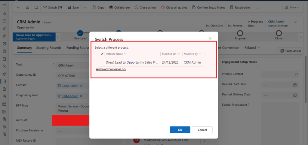 - 1] Users cannot switch the BPF directly on Opportunity (Even if you use OOB Switch Process, it would only show the in use Active BPF, as it discourages switching when not in the Primary Entity Form)