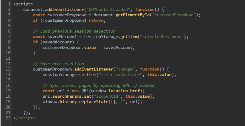I first used localStorage for the customer selection. While it worked across pages, it had one drawback: