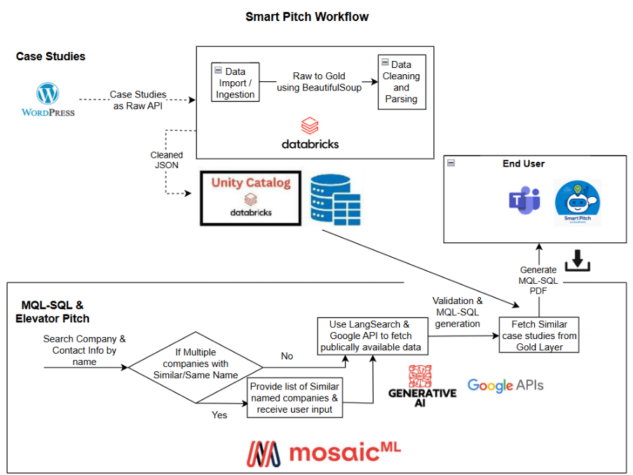 The last stage was migrating SmartPitch into Databricks Mosaic AI, part of the Lakehouse AI platform. This was where SmartPitch matured into an enterprise-grade solution.
