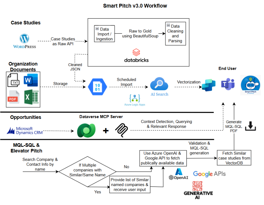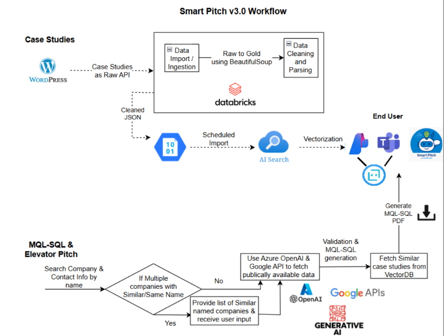 The idea for SmartPitch came directly from observing the day-to-day struggles of sales and pre-sales teams. Every Marketing Qualified Lead (MQL) to Sales Qualified Lead (SQL) conversion required hours of manual work: searching through documents stored in SharePoint, combing through case studies, aligning them with solution areas, and finally packaging them into a client-ready pitch deck.